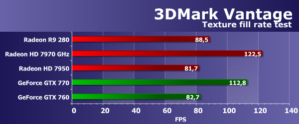 Синтетические тесты из пакета 3DMark Vantage покажут нам то, что мы ранее упустили. Feature тесты из этого тестового пакета обладают поддержкой DirectX 10 и интересны тем, что отличаются от наших и до сих пор актуальны. При анализе результатов свежей видеокарты Radeon R9 280 в этом пакете мы сделаем какие-то новые и полезные выводы, ускользнувшие от нас в тестах из пакетов семейства RightMark. Feature Test 1: Texture Fill