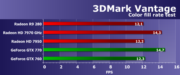 Что касается сравнения скорости платы Radeon R9 280 с решениями конкурента, то новинка AMD по текстурной скорости обгоняет прямого конкурента в лице Geforce GTX 760, но уступает старшей GTX 770, близкой к уровню HD 7970 GHz. Тут нужно учитывать, что GTX 770 заметно дороже, и не является прямым конкурентом для рассматриваемой модели Radeon. Feature Test 2: Color Fill