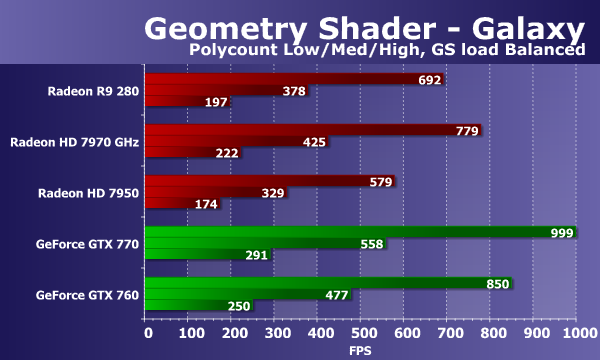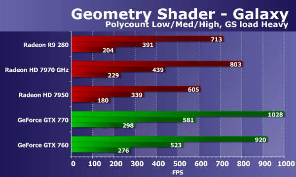 Мартовская новинка Radeon R9 280 основана на чипе Tahiti, который имеет некоторые оптимизации геометрического конвейера, и он не слишком уступает мощному варианту платы прошлого поколения. Ну а HD 7950 отстала от новинки на 15-20%. А вот у видеокарт Geforce с геометрической производительностью дело всегда обстоит лучше, поэтому обе они оказываются быстрее. Посмотрим, как изменится ситуация при переносе части вычислений в геометрический шейдер: