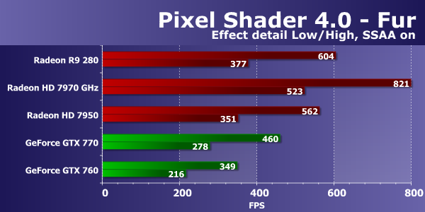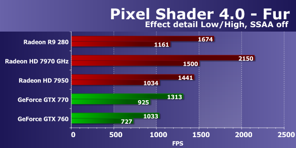 Первым тестом пиксельных шейдеров будет Fur. При самых низких настройках в нем используется от 15 до 30 текстурных выборок из карты высот и две выборки из основной текстуры. Режим Effect detail — «High» увеличивает количество выборок до 40—80, включение «шейдерного» суперсэмплинга — до 60—120 выборок, а режим «High» совместно с SSAA отличается максимальной «тяжестью» — от 160 до 320 выборок из карты высот.