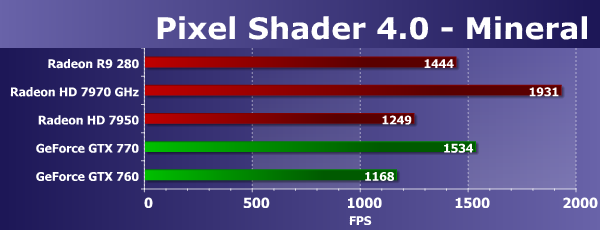 Результаты предельных математических тестов чаще всего лишь примерно соответствуют разнице по частотам и количеству вычислительных блоков, а на результаты также влияет и разная эффективность их использования в конкретных решениях, равно как и оптимизация драйверов. В случае теста Mineral, новая модель Radeon R9 280 оказалась на 16% быстрее своего аналога из предыдущего поколения (HD 7950), что обусловлено достаточно высокой Boost-частотой.
