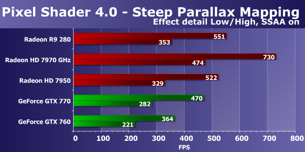 Если сравнивать скорость заполнения сцены видеокартой Radeon R9 280 с видеокартами Nvidia, то рассматриваемая нами сегодня модель AMD показала в этом тесте почти такую же скорость заполнения сцены, что и конкурирующая с ней по цене Geforce GTX 760, ну и GTX 770 вполне ожидаемо стала лидером сравнения в целом — она же и дороже всех. Feature Test 3: Parallax Occlusion Mapping