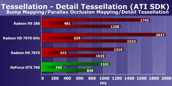 В данном случае скорость видеокарт упирается в ПСП, и новая плата компании AMD по этому параметру слегка отстает от Radeon HD 7970 GHz (к сожалению, результатов HD 7950 в DirectX 11 тестах нет, и ее частично заменяет HD 7870). Главное, что есть ощутимое превосходство над прямым конкурентом в лице Geforce GTX 760, которую новинка обогнала чуть ли не в полтора раза.