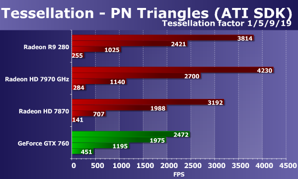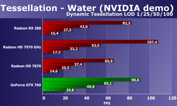 Мы тестируем все видеоплаты при четырех разных коэффициентах тесселяции — в данном случае настройка называется Dynamic Tessellation LOD. Если при самом первом коэффициенте разбиения треугольников, когда скорость не ограничена производительностью геометрических блоков, видеокарты Radeon от компании AMD показывают достаточно высокие результаты (Radeon R9 280 почти на уровне Geforce GTX 760), то уже в следующей ступени все они уже не дотягиваются до скорости плат Nvidia. При увеличении геометрической работы платы калифорнийской компании вырываются вперед, а производительность всех Radeon снижается много сильнее.