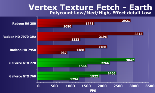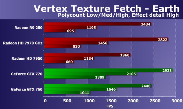 В тестах «Vertex Texture Fetch» измеряется скорость большого количества текстурных выборок из вершинного шейдера. Тесты схожи, по сути, так что соотношение между результатами карт в тестах «Earth» и «Waves» должно быть примерно одинаковым. В обоих тестах используется displacement mapping на основании данных текстурных выборок, единственное существенное отличие состоит в том, что в тесте «Waves» используются условные переходы, а в «Earth» — нет.