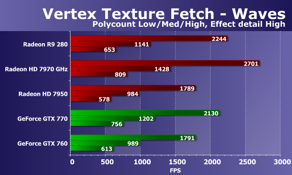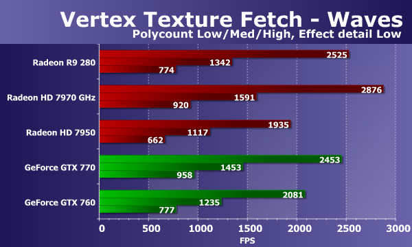 Рассмотрим результаты второго теста текстурных выборок из вершинных шейдеров. Тест «Waves» отличается меньшим количеством выборок, зато в нем используются условные переходы. Количество билинейных текстурных выборок в данном случае до 14 («Effect detail Low») или до 24 («Effect detail High») на каждую вершину. Сложность геометрии изменяется аналогично предыдущему тесту.