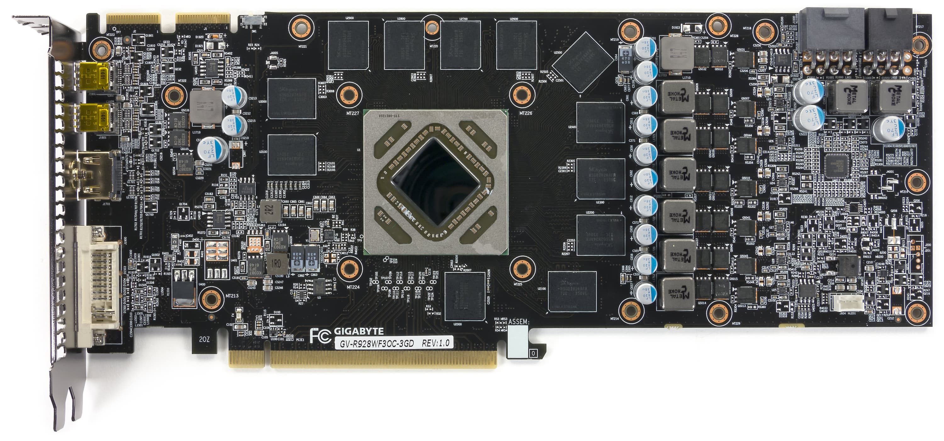 Карта имеет 3072 МБ памяти GDDR5 SDRAM, размещенной в 12 микросхемах по 2 Гбит (на лицевой стороне PCB). Микросхемы памяти SK Hynix (GDDR5). Микросхемы рассчитаны на максимальную частоту работы в 1250 (5000) МГц. | ![]() |