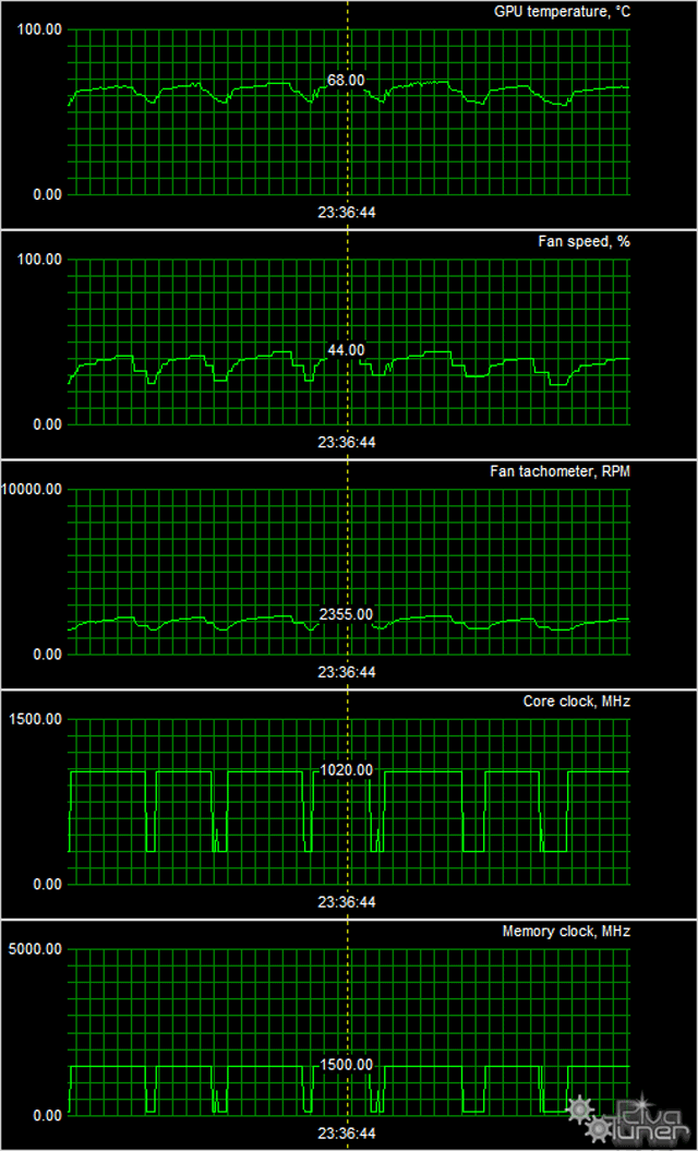 В режиме максимальной нагрузки в 3D температура быстро достигала 68 °C, вентиляторы при этом раскручивались до почти 2400 оборотов в минуту, шум вырастал до 46,2 дБА, после чего температура стабилизировалась на этом уровне. Шум от кулера весьма высокий, если сравнивать с конкурирующими решениями. Очевидно, система охлаждения карты рассчитана в первую очередь на сценарий разгона: отсюда и относительно высокая частота вращения вентиляторов даже в простое, и явно неадекватное усиление воздушного потока под 3D-нагрузкой, когда температура ядра сохраняется на невысоком уровне. Зато этот кулер обеспечит нормальное охлаждение карты даже при серьезном разгоне.