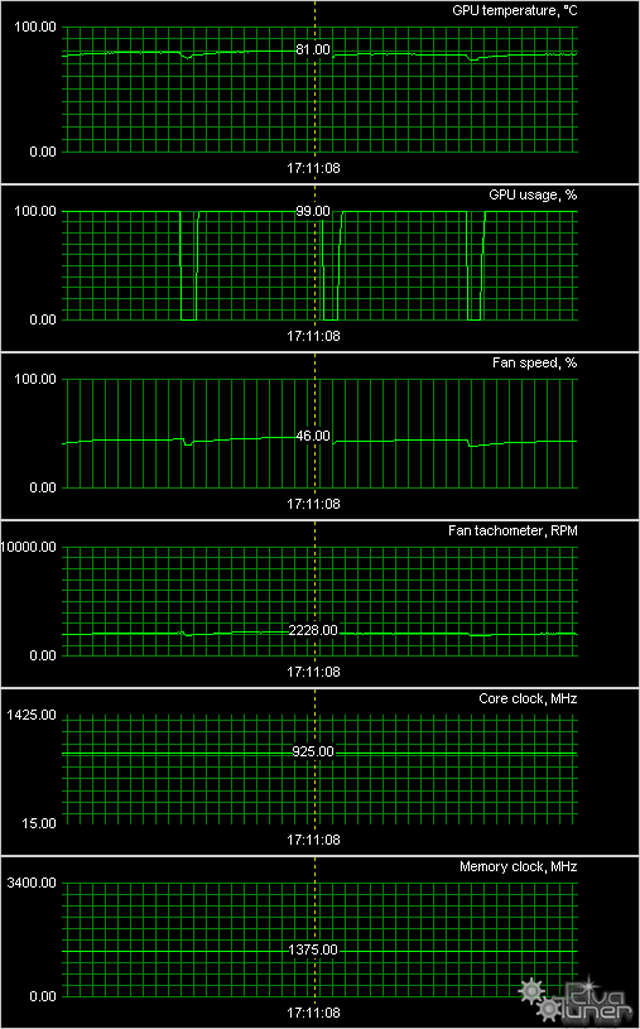 Мы провели исследование температурного режима с помощью утилиты MSI Afterburner (автор А. Николайчук AKA Unwinder) и получили следующие результаты: