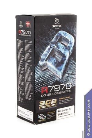 XFX R7970 Double Dissipation (Radeon HD 7970) 3072 МБ 384-битной GDDR5 PCI-E — также интересное решение для тех, кому не нужны особые возможности для разгона, и кто довольствуется стандартными возможностями одного из самых быстрых на сегодня ускорителей игрового класса. Видеокарта снабжена хорошей системой охлаждения, продемонстрировавшей нам более позитивные показатели, чем можно наблюдать у кулера, поставляемого с референс-картой. И даже, несмотря на наличие двух вентиляторов, СО более тихая, чем референс.