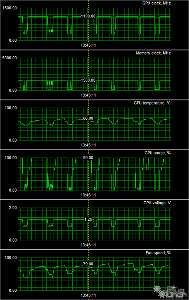 Мы провели исследование температурного режима с помощью утилиты EVGA PrecisionX (автор А. Николайчук AKA Unwinder) и получили следующие результаты: