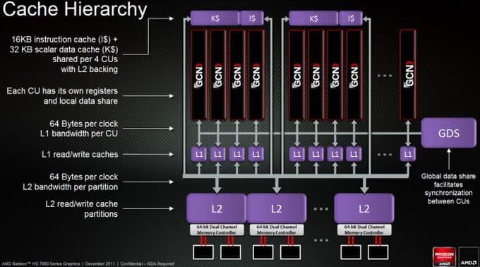 Базовым блоком в новой архитектуре является блок GCN. Именно на таких «кирпичиках» основаны все новые графические процессоры серии Southern Islands. Архитектура впервые для графических чипов компании AMD использует не VLIW-дизайн, в нём применяются векторные и скалярные блоки, и одним из самых важных изменений стало то, что каждый из вычислительных блоков GCN имеет свой планировщик и может выполнять инструкции из различных программ (kernel).