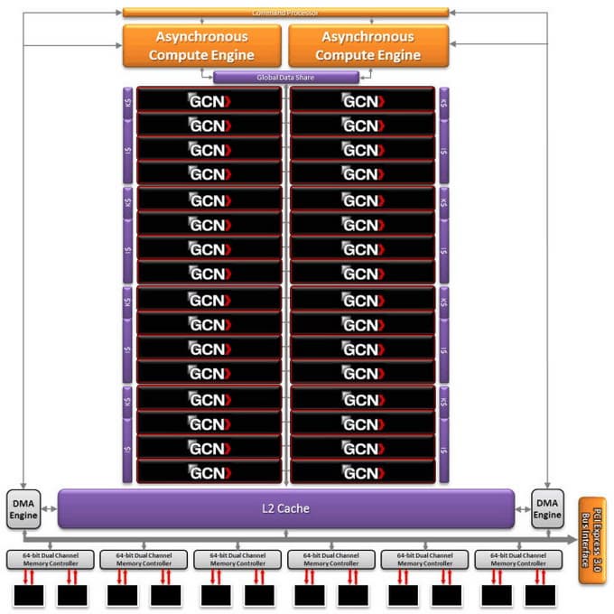 - 32 вычислительных блока GCN, включающих 128 SIMD-ядер, состоящих в целом из 2048 ALU для расчётов с плавающей запятой (целочисленные и плавающие форматы, поддержка точности FP32 и FP64 в рамках стандарта IEEE 754)