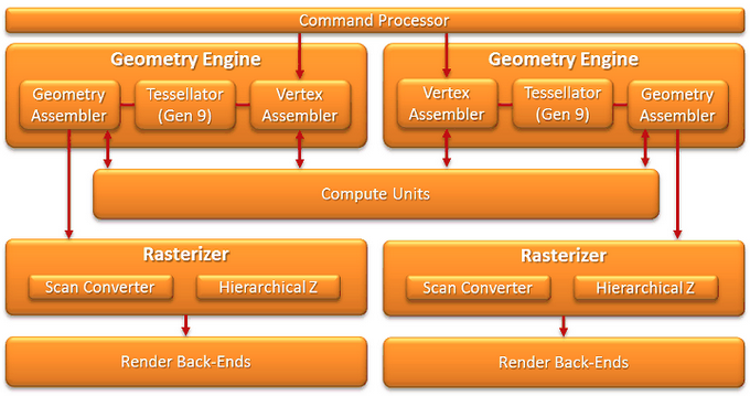 Несмотря на схематическое сходство, последнее поколение этих блоков способно на значительно большую производительность тесселяции и обработки геометрии, так как блоки подверглись значительным модификациям. Хотя пиковая производительность выросла лишь почти до двух миллиардов вершин и примитивов в секунду (925 МГц и две вершины а такт), реальная производительность выросла больше. Это было достигнуто при помощи увеличения объёма кэшей, улучшения буферизации геометрических данных и повторного использования вершинных данных.