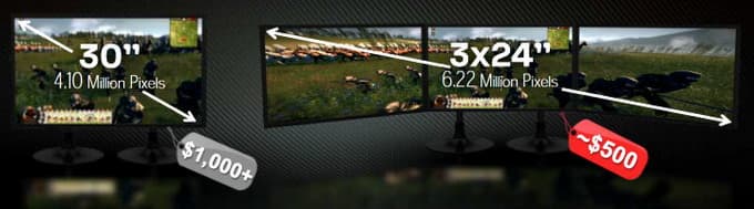 И действительно, сейчас выгодне купить три монитора с диагональю экрана в 24″, чем один 30-дюймовый. AMD приводит именно такой пример, когда 30″ монитор с разрешением 2560×1600 стоит более $1000, а три 24″ FullHD можно купить за половину этой цены:
