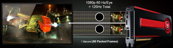 Для таких задач стали применять формат frame packing, когда кадры для левого и правого глаза объединяются в один, и AMD Radeon HD 7970 поддерживает формат HDMI 1.4a frame packing для вывода стереокартинки. Это первая видеокарта с поддержкой 3-гигагерцового HDMI с frame packing, когда на каждый глаз приходится FullHD картинка с частотой 60 Гц (120 Гц в итоге):