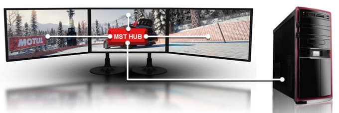 Вывод изображения на шесть мониторов может быть осуществлён при помощи двух портов DisplayPort 1.2 и двух концентраторов MST (о которых мы писали ранее), а три или даже четыре монитора потребуют лишь одного порта и соответствующего концентратора. Такие концентраторы позволяют гибко конфигурировать систему вывода изображения, они поддерживают до четырёх FullHD-устройств на один разъём DisplayPort 1.2 и должны появиться в продаже к лету 2012 года.