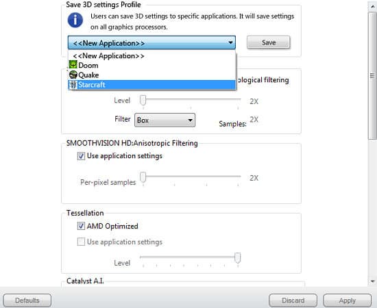 Чтобы статья была максимально полной, упомянем и основное нововведение AMD Catalyst 12.1 — пользовательские профили для 3D-приложений, позволяющие изменять базовые настройки качества и установки CrossFire отдельно для каждой программы (наконец-то AMD догнала конкурентов):