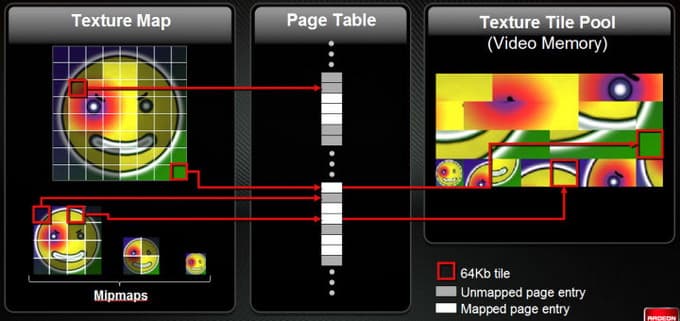 Используя виртуальную видеопамять, очень легко получить эффективную аппаратную поддержку подобных алгоритмов, позволяющих применять в приложении до 32 терабайт текстур, что даёт возможность сделать уникальные локации в играх, без повторяющихся кусков текстур, при полном отсутствии проблем с подгрузкой текстурных данных. Правда, наглядный пример AMD приводит слишком странный, из которого ничего особо непонятно: