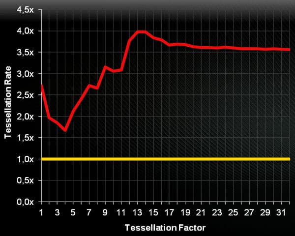 В результате, производительность тесселяции улучшена при всех коэффициентах разбиения треугольников до четырёх раз, по сравнению с Radeon HD 6970 из предыдущего поколения. Но четыре раза достигаются не во всех случаях даже на диаграмме от самой AMD:
