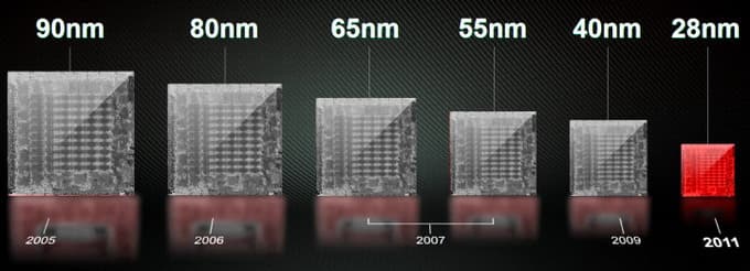 К слову о техпроцессах — именно компания AMD является их первопроходцем на рынке графических процессоров. В последние несколько лет эта компания опережала своего единственного сильного конкурента — Nvidia — по внедрению всех новых техпроцессов. Вот и сейчас они первые успели анонсировать свой новый продукт ещё в уходящем 2011 году (фотографии кристаллов схематичны, к сожалению):