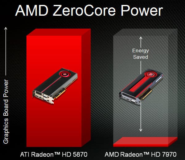 AMD приводит схематическое сравнение со своей же Radeon HD 5870, которая поддержкой такой технологии не обладала. ZeroCore — эксклюзивное нововведение Southern Islands, пришедшее в настольные решения из мобильных GPU, предназначенных для ноутбуков. Кстати, преимущества этой технологии связаны не только со снижением потребления. Кроме этого, в режиме длительного простоя при отключении дисплея видеокарта ещё и полностью выключает вентилятор на кулере видеокарты!