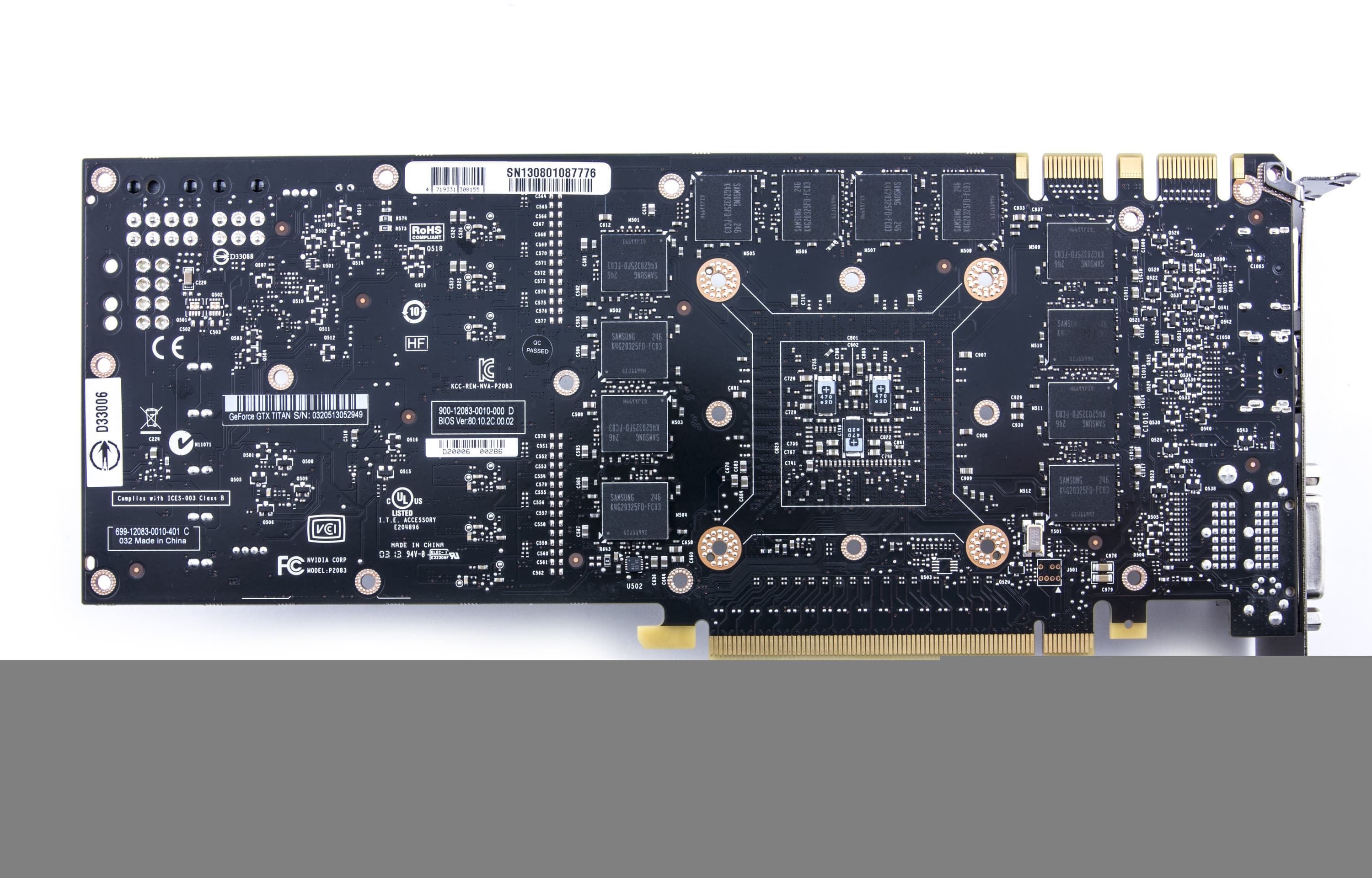 Как мы видим, в целом размеры карты не выходят за рамки принятых стандартов для топовых ускорителей: 270×100 мм. Да и занимает она традиционные 2 слота (хотя, по идее, трехслотовые ускорители должны уже стать стандартом, если речь идет о топовых продуктах). PCB у Titan логично отличается от GTX 680, поскольку карты имеют разные как шины обмена с памятью, так и наборы микросхем памяти (у GTX 680 — 256 бит и 8 микросхем, а у Titan — 384 бит и 24 микросхемы). Система питания имеет 6 фаз для ядра и 2 фазы для микросхем памяти. Управляется БП цифровым контроллером NCP 4206 компании On Semiconductor.