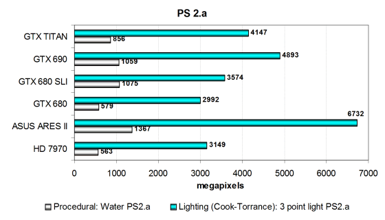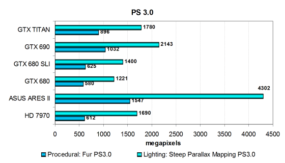 В тесте простого бампмаппинга все платы упираются в ПСП, скорее всего, и результат новой видеокарты Nvidia примерно соответствует скорости Radeon HD 7970. Новинка от компании Nvidia опережает младшую сестру на треть и уступает двухчиповой модели — Geforce GTX 690, все в соответствии с теорией. Во втором подтесте с более сложными попиксельными расчетами все примерно так же, по скорости плата Titan расположилась между GTX 680 и GTX 690 и примерно там же находится единственный соперник от компании AMD. Эффективность выполнения сложных математических вычислений в пиксельных шейдерах у чипов архитектуры GCN несколько выше, ведь GK110 гораздо сложнее Tahiti.
