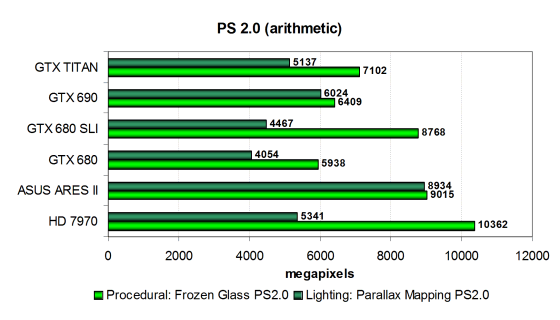 Во втором тесте «Parallax Mapping» новая видеокарта Nvidia показала производительность ровно между GTX 680 и GTX 690, как и ожидалось, исходя из теории. Radeon HD 7970 от конкурента также где-то близко по скорости, а вот двухчиповая ARES II вырвалась далеко вперед. Рассмотрим эти же тесты в модификации с предпочтением выборок из текстур математическим вычислениям: