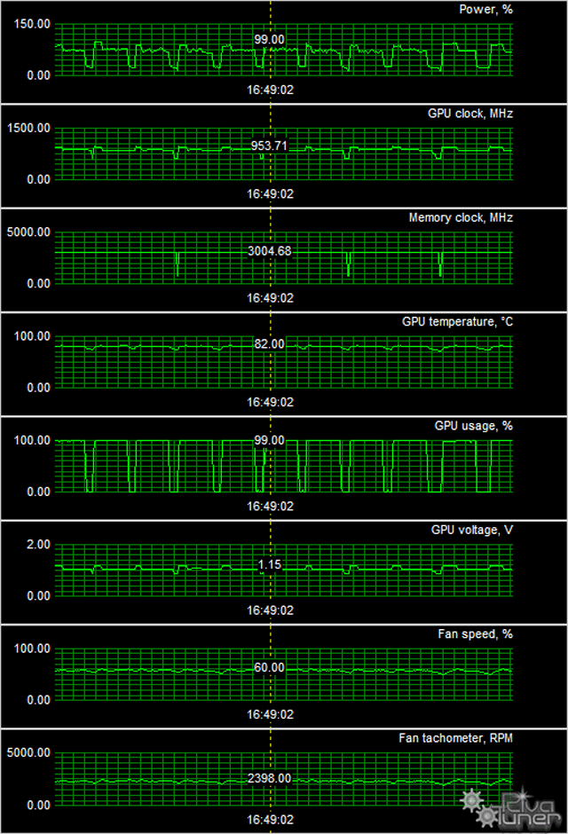 После 6 часов прогона карты под максимальной игровой нагрузкой максимальная температура ядра составила 82 градуса, что для топового ускорителя более чем удовлетворительно. Так что СО получилась весьма эффективной, хоть и шумноватой.