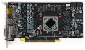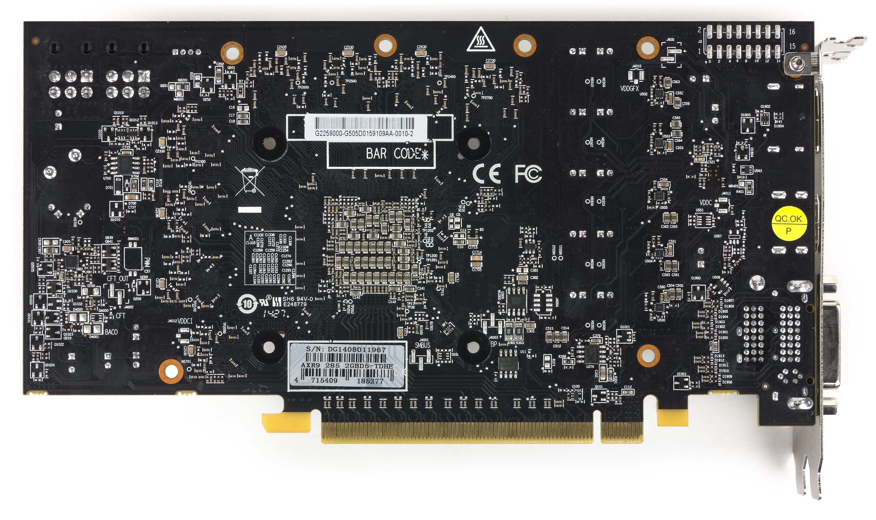 PCB ускорителя Powercolor мало чем отличается от эталонной карты (в ее роли выступил продукт Gigabyte, действительно являющийся копией референс-карты). Лишь за счет оптимизации размещения элементов на печатной плате удалось уменьшить длину PCB.