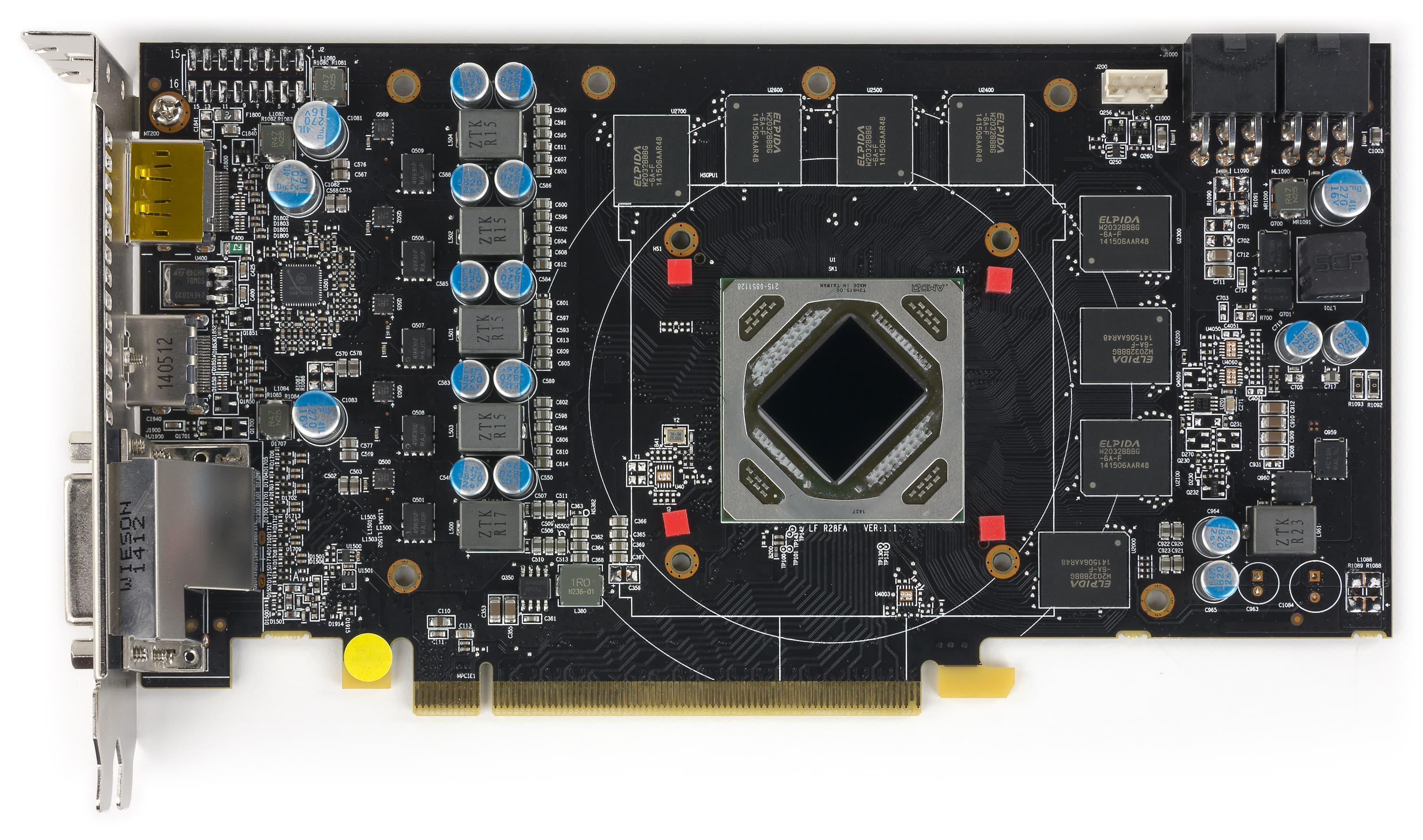 Картa имеeт 2048 МБ памяти GDDR5 SDRAM, размещенной в 8 микросхемах по 2 Гбит (на лицевой стороне PCB). Микросхемы памяти Elpida (GDDR5). Микросхемы рассчитаны на номинальную частоту работы в 1500 (6000) МГц. | ![]() |
