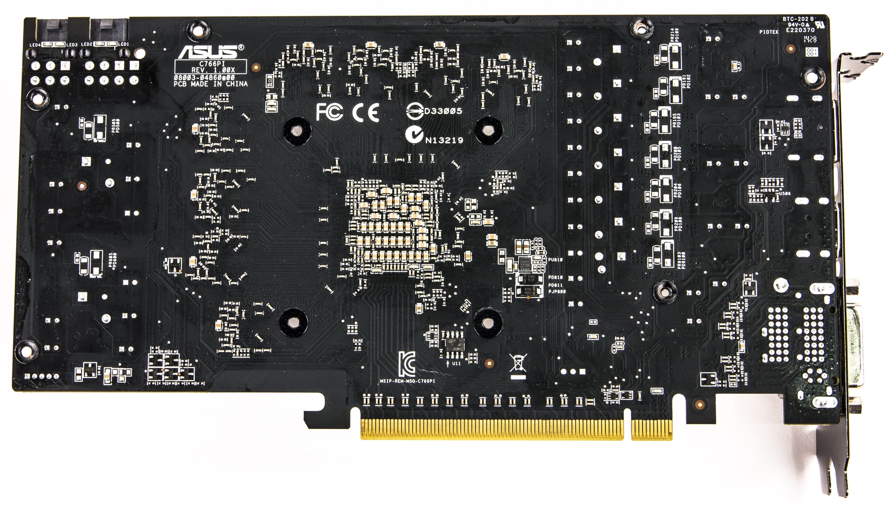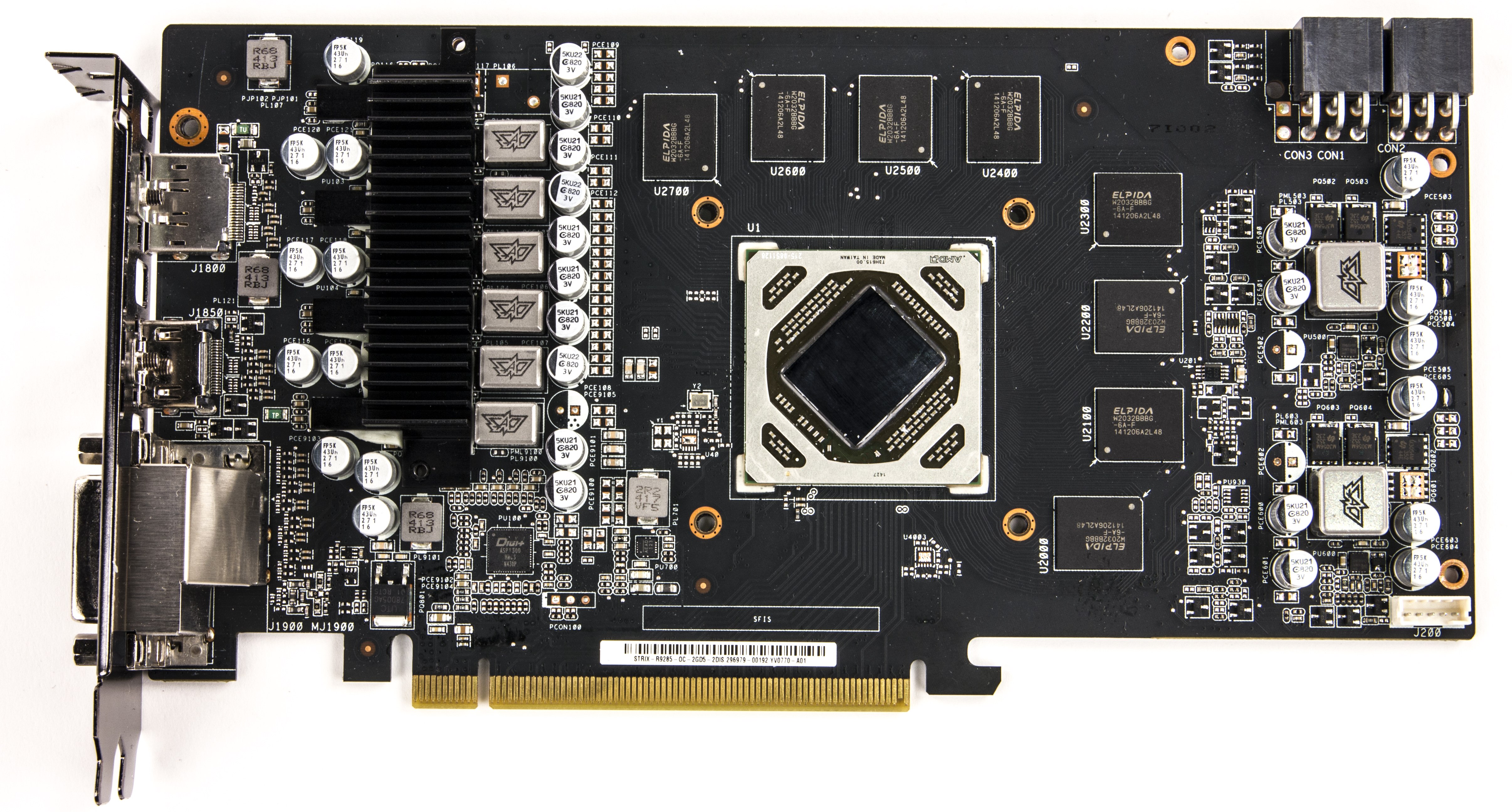 PCB несколько переработана и немного потеряла в длине (правда, из-за габаритного кулера в целом видеокарта выглядит большой). Традиционно в стиле Asus переделан блок питания: схема управляется цифровым контроллером Digi+ ASP1211, а при изготовлении платы применяется технология Super Alloy Power, что вкупе с использованием специальных конденсаторов уменьшает энергопотребление и нагрев.