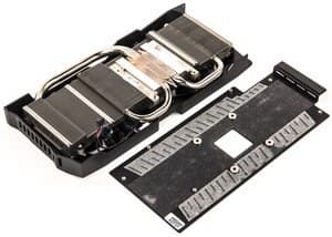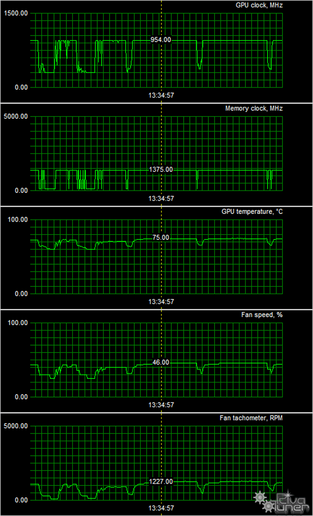 В режиме максимальной нагрузки в 3D температура быстро достигала 75 °С, вращался только один вентилятор (менее 1300 оборотов в минуту, шум 33,5 дБА), второй в простое.