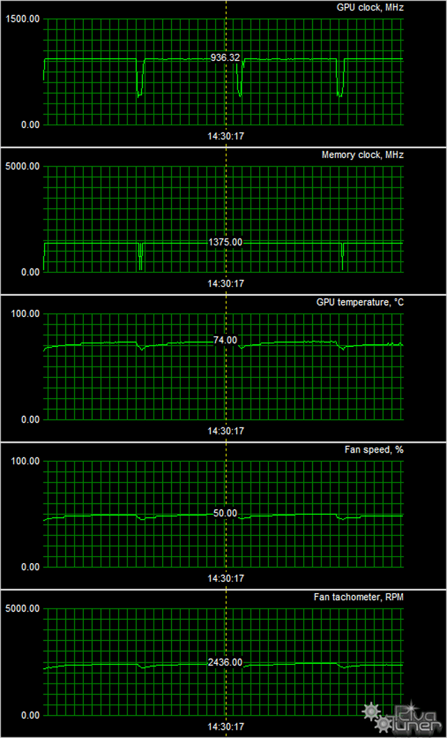 В режиме максимальной нагрузки в 3D температура достигала 65 °С при непрерывном росте оборотов вентиляторов (до 45%, или 2200 оборотов в минуту), затем температура и частоты вращения вентиляторов стабилизируются на уровне 73-74 °С и 2400 оборотов в минуту соответственно. Максимальный уровень шума — 39,8 дБА.