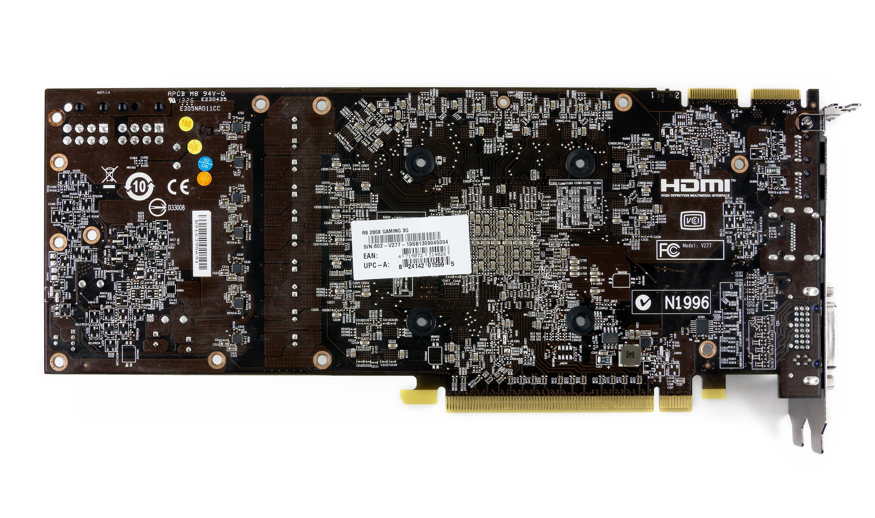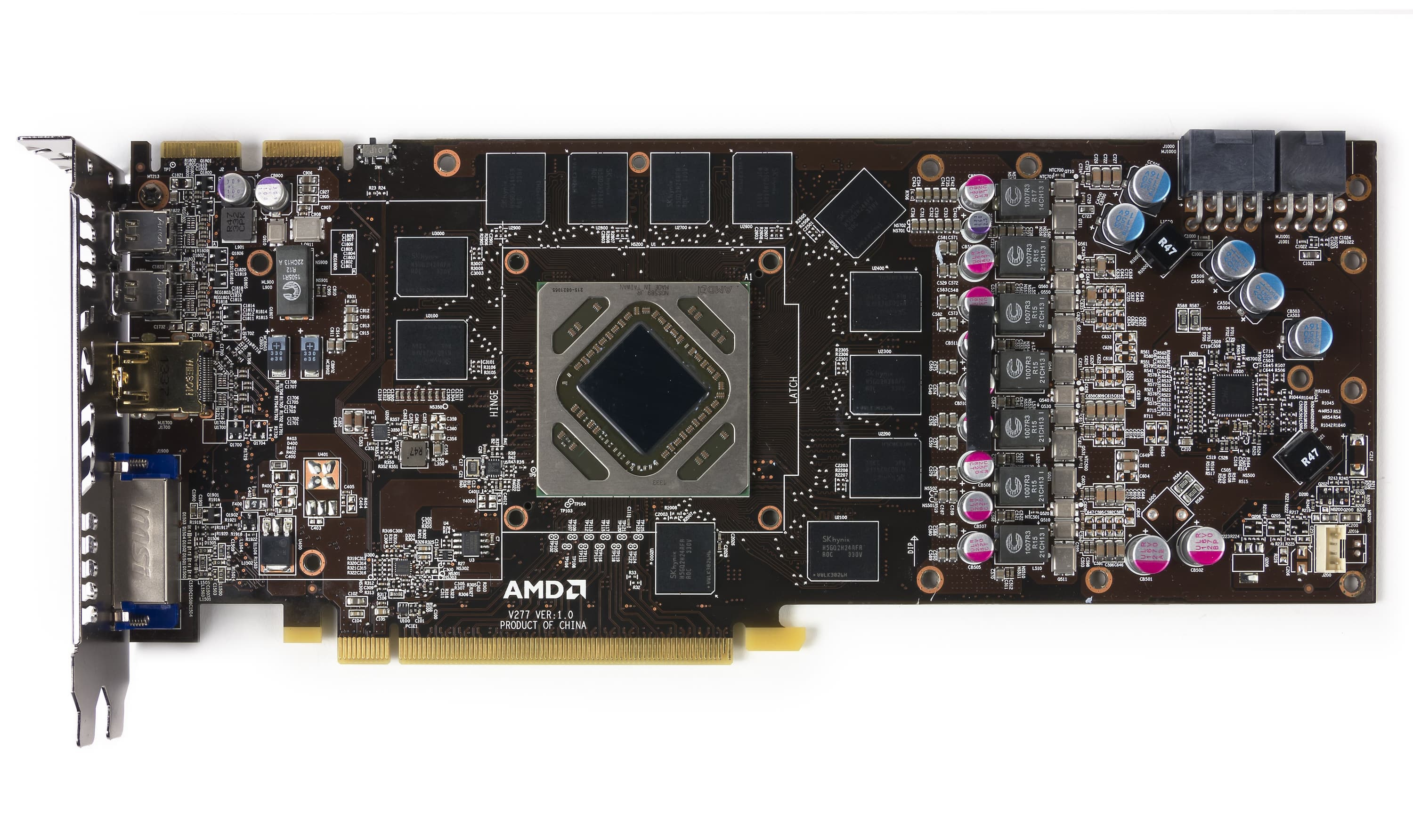 Схема питания 5-фазная для ядра и 2-фазная для микросхем памяти, управляется цифровым контроллером. Набор гнезд вывода картинки также изменился со времен Radeon HD 7970/R9 280. Наличие двух видеовыходов DP (как было у R9 280) посчитали лишним, поэтому вернули второе гнездо DVI (на 280 было одно), и теперь ускоритель может выводить картинку на приемники со всеми популярными ныне интерфейсами (причем в полноформатном виде, переходники с мини-форматов не требуются).