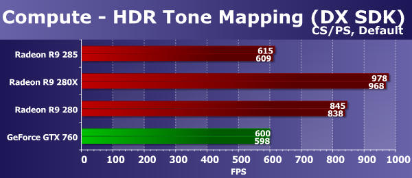 В данном случае скорость видеокарт упирается явно в ПСП. И увы, новая плата компании AMD по этому параметру заметно отстаёт от Radeon R9 280, просто из-за 256-битной шины против 384-битной. Видимо, сжатие кадрового буфера в этой задаче не работает достаточно эффективно. Если сравнить новинку с прямым конкурентом в лице Geforce GTX 760, то их результаты очень близки, что также говорит в пользу теории об упоре в ПСП.