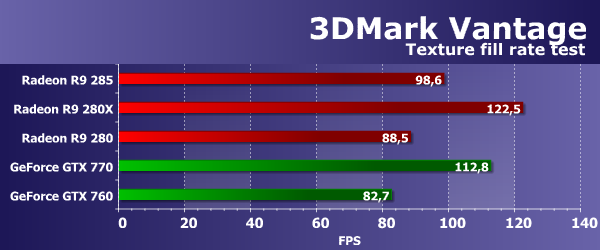Синтетические тесты из пакета 3DMark Vantage покажут нам то, что мы ранее упустили. Feature тесты из этого тестового пакета обладают поддержкой DirectX 10 и интересны тем, что отличаются от наших и до сих пор актуальны. При анализе результатов анонсированной сегодня видеокарты Radeon R9 285 в этом пакете мы сделаем какие-то новые и полезные выводы, ускользнувшие от нас в тестах из пакетов семейства RightMark. Feature Test 1: Texture Fill