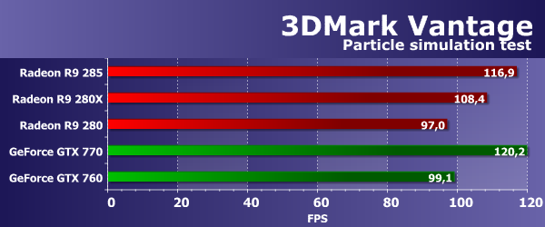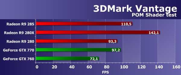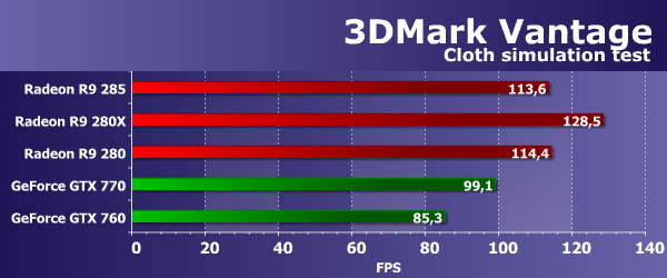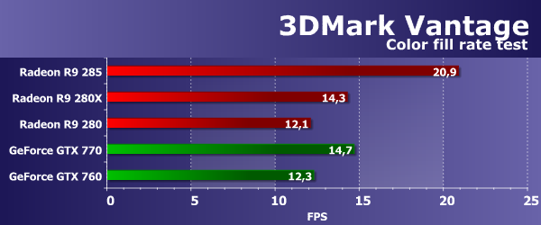 Во втором геометрическом тесте из 3DMark Vantage ситуация совершенно иная, и на этот раз новая Radeon R9 285 оказалась значительно производительнее своей предшественницы R9 280 — разница между их производительностью составила более 20%. Да и R9 280X новинка обогнала! Похоже, что именно в этом тесте больший упор именно в геометрическую производительность, а частично и в скорость заполнения, которая в Tonga также стала выше из-за эффективного сжатия кадрового буфера.
