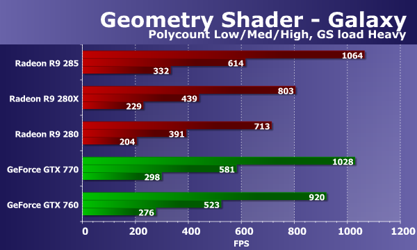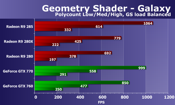 При изменении нагрузки в этом тесте цифры слегка улучшились для некоторых плат. Видеокарты в этом тесте геометрических шейдеров слабо реагируют на изменение параметра GS load, отвечающего за перенос части вычислений в геометрический шейдер, поэтому и выводы остаются прежними. Новинка Radeon R9 285 быстрее заменяемой ей модели на 50-60%, и всё так же опережает в том числе и R9 280X. В остальном в выводах ничего не изменилось, обе платы Geforce также уступают новинке, хотя GTX 770 показывает скорость почти на том же уровне.