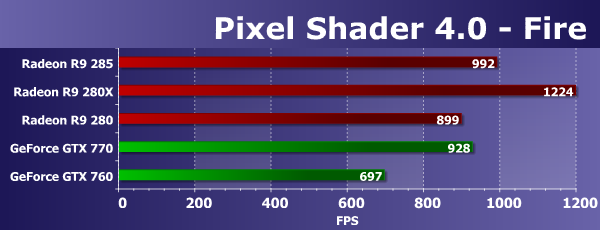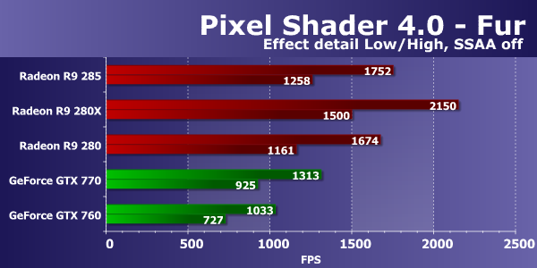 Во втором подтесте со сложными попиксельными расчетами новинка уже на 9% быстрее Radeon R9 280, хотя отставание от старшей модели на Tahiti осталось. А вот преимущество над Geforce GTX 760 лишь увеличилось, ведь эффективность выполнения таких математических вычислений в пиксельных шейдерах у чипов архитектуры GCN заметно выше, чем у Kepler.