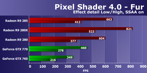 Снова мы видим, что графические решения Radeon в наших D3D10-тестах пиксельных шейдеров работают более эффективно, по сравнению с конкурирующими Geforce. Свежая видеоплата на новом чипе Tonga показывает скорость на 8-15% выше, чем Radeon R9 280, и снова опережает в том числе и старшую из конкурирующих плат Nvidia.