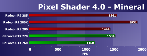 Результаты предельных математических тестов чаще всего лишь примерно соответствуют разнице по частотам и количеству вычислительных блоков, а на результаты также влияет и разная эффективность их использования в конкретных решениях, равно как и оптимизация драйверов. В случае теста Mineral, новая модель Radeon R9 285 оказалась на 8% быстрее заменяемой ей видеокарты с индексом R9 280, что снова может быть обусловлено лишь более высокой Boost-частотой — очень похоже, что обновленный PowerTune и переработанный чип действительно даёт 5-10% преимущества при прочих равных.
