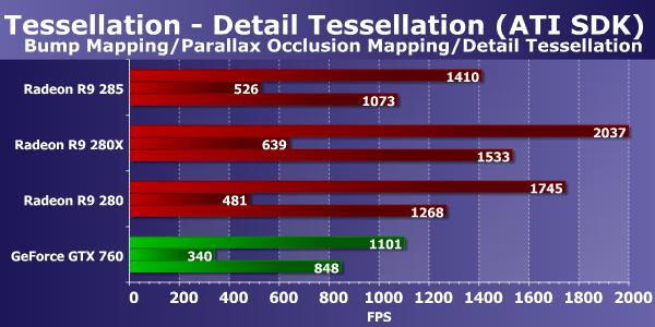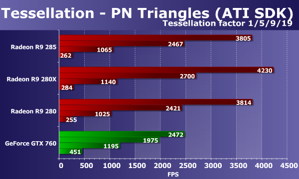 При увеличении геометрической работы платы калифорнийской компании обычно вырываются вперед, а производительность старых Radeon снижается много сильнее. А вот новинка в лице Radeon R9 285 на базе чипа Tonga показывает себя просто отлично, она не просто опередила заменяемую ей модель R9 280 до двух раз, но легко превзошла и более мощную плату Radeon R9 280X. И хотя в более простых условиях представленная сегодня видеокарта проигрывает конкурирующей с ней Geforce GTX 760, в самом сложном режиме она даже вырвалась вперёд! Просто отличный результат для нового решения, AMD наконец-то сделала графический процессор среднего ценового уровня, который по геометрической производительности не уступает соперничающим с ним решениям от Nvidia, и в тесте тесселяции он оказался не хуже GK104.