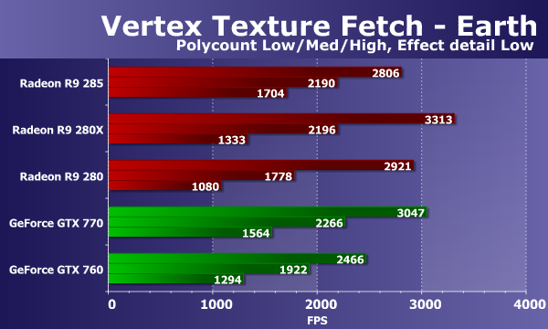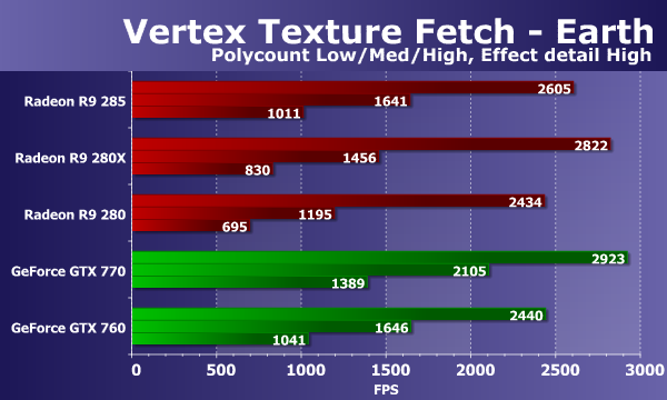В тестах «Vertex Texture Fetch» измеряется скорость большого количества текстурных выборок из вершинного шейдера. Тесты схожи, по сути, так что соотношение между результатами карт в тестах «Earth» и «Waves» должно быть примерно одинаковым. В обоих тестах используется displacement mapping на основании данных текстурных выборок, единственное существенное отличие состоит в том, что в тесте «Waves» используются условные переходы, а в «Earth» — нет.
