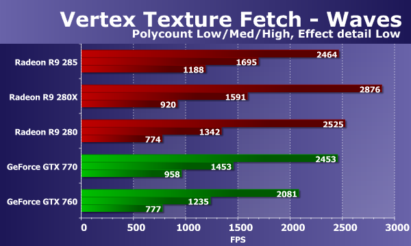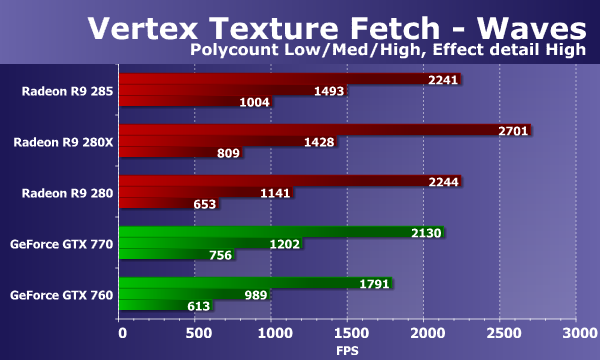 Рассмотрим результаты второго теста текстурных выборок из вершинных шейдеров. Тест «Waves» отличается меньшим количеством выборок, зато в нем используются условные переходы. Количество билинейных текстурных выборок в данном случае до 14 («Effect detail Low») или до 24 («Effect detail High») на каждую вершину. Сложность геометрии изменяется аналогично предыдущему тесту.