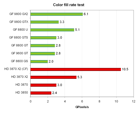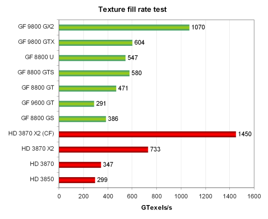 Не совсем понятно, почему получаются такие большие цифры (в гигатекселях за секунду)… Хотя соотношение результатов в целом походит на истинное, но используются явно не те условия, в которых карты на основе чипов G9x получают дополнительное преимущество, поэтому цифры не очень хорошо соотносятся с нашими из RightMark.