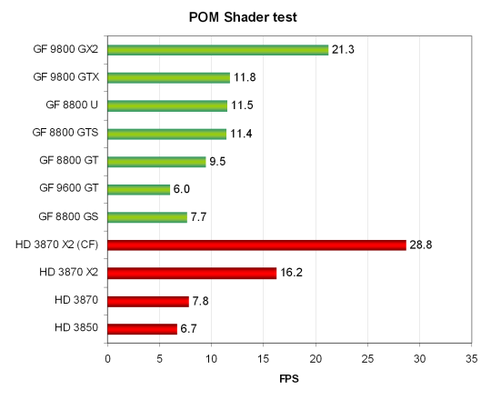 Видно, что решения Nvidia в целом сильнее соответствующих карт AMD. Только Geforce 9600 GT несколько отстаёт от HD 3850, но не критично. Также хорошо заметно, что двухчиповый рендеринг этого теста весьма эффективен, соответствующие карты получают близкий к двукратному прирост производительности. Интересно, что Geforce 8800 Ultra показывает примерно тот же результат, что и топовые карты на основе G92, скорость действительно ограничена текстурной производительностью и скоростью шейдерных блоков одновременно.