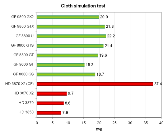 Этот тест интересен тем, что рассчитывает физические взаимодействия (имитация ткани) при помощи видеочипа. Используется вершинная симуляция, при помощи комбинированной работы вершинного и геометрического шейдеров, с несколькими проходами. Используется stream out для переноса вершин из одного прохода симуляции к другому. Таким образом, тестируется производительность исполнения вершинных и геометрических шейдеров, и скорость stream out.