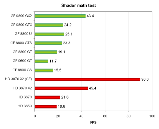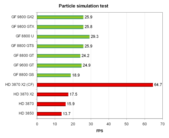 Если отбросить этот результат, то всё остальное плачевно для AMD, все их карты не достают до медленнейшей из Nvidia — Geforce 9600 GT, отставая от конкурентов до двух раз. Но и у тех получились результаты довольно странные — разница между 9600 GT и 9800 GTX меньше, чем полтора раза. Такое впечатление, что скорость не зависит от шейдерной производительности, а зависит от скорости stream out или даже вершинной производительности…